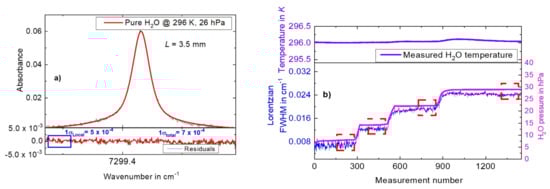 The right y-axis of Figure 2b shows the gas pressure measured at different values of the FWHM. As indicated by the dotted red boxes, 50 consecutive measurements were used to determine the repeatability (calculated as the standard deviation of the mean) of the measured Lorentzian width of 5.66 × 10−5 cm−1, i.e., 0.46% at, e.g., the FWHM of 0.012391 cm−1. We note here that the relative uncertainty from fitting to derive the Lorentzian FWHM was estimated to be 1.1%. This value was calculated from the statistical uncertainty (repeatability: 0.46%) and the uncertainty of 1% (estimated here based on our experiences [9,18]) due to lack of knowledge on the accuracy of the Voigt profile to fit H2O spectra as observed in [43]. This uncertainty component (1.1%) combined with the uncertainty of the wavenumber axis (1%, similar to [18]) was used to evaluate the combined uncertainty of the retrieved Lorentzian FWHM of 1.5% (relative). The red boxes (at the end of the measurement step where the highest temporal stability is found) show the regions where the analysis of the FWHM was performed at the different gas pressures (repeatability of the measured H2O pressure was 0.007 hPa, i.e., 0.09% at the lowest gas pressure of 8 hPa) shown on the y-axis (right). A check of the Lorentzian width versus line area showed no significant systematic effects due to absorption/desorption. The absorption/desorption effects are folded into the repeatability of the FWHM measurements.