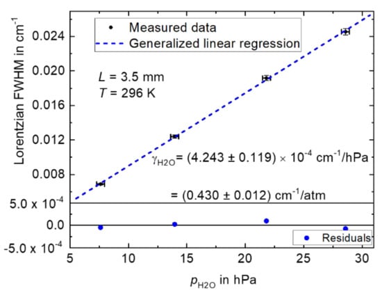 Figure 3 shows the Lorentzian FWHM (derived from the data in Figure 2b, bottom panel) for pure self-broadening as a function of the H2O pressure pH2O. The uncertainties (error bars) of the Lorentzian FWHM and pH2O are 1.5% relative (as presented, estimated taking into account the repeatability of the measurements, fitting and the uncertainty of the wavenumber axis estimated similar to [7]) and 1.2% relative at 28.6 hPa, respectively. The uncertainties of the measured gas pressure were estimated considering the repeatability of the measurements and the respective uncertainties (derived using the calibration certificate) at the different pressure points. A generalized linear regression (GLR) was applied to the data in Figure 3 in order to derive the self-broadening coefficient for the H2O absorption line at 7299.43 cm−1. The GLR was performed using B_Least software promoted by ISO standard 6143 [44]. From the GLR in Figure 3, a self-broadening coefficient ƳH2O (evaluated from the slope, according to Equation (2)) of (4.243 ± 0.118)·10−4 cm−1/hPa was derived at (296 ± 1) K, corresponding to (0.430 ± 0.012) cm−1/atm, k = 1. The combined uncertainty of the self-broadening coefficient was 0.012 cm−1/atm (2.8% relative, k = 1). The quantity k is a coverage factor [28]. In this work, the units cm−1/atm were used in order to compare the results to those reported in the HITRAN database [26].