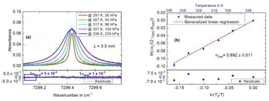 (a) Temperature dependence exponent of air broadening: absorbance data at 293 K and 473 K. (b) A GLR linear regression applied to measured data to determine the temperature dependence coefficient of air broadening. RMS error: 1.30 × 10−16.