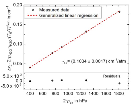 A GLR linear regression applied to measured data to determine the air broadening coefficient (γair) of the H2O line at 7299.43 cm−1 at (295.04 ± 1) K. RMS error: 1.04 × 10−16. The correlation coefficients between the x- and y-axis are assumed to be unity.