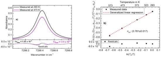 Figure 6a depicts typical absorbance data (derived similarly as for Figure 2a, measured at 293 K and 473 K, 100 averaged scans) for the temperature dependence measurements of air broadening. The data were fitted with a Voigt profile, similar to Figure 2a, to derive the Lorentzian FWHM (. The bottom panel of Figure 6a shows the residuals from the Voigt fit with 1σtotal = 1.05 × 10−3 and 1σtotal = 1.11 × 10−3 for the data at 293 K and 473 K, respectively. Using the residuals from the fits and the respective peak absorbances of 0.55 (at 293 K) and 0.43 (at 473 K), S/N values of 523 and 387 were found, respectively. The residual structures in Figure 6a are observed to be a result of the possible systematic deficiencies of the Voigt profile to model higher order line shape contributions like the Hartmann–Tran profile [40,41,42]. This is accounted for by the uncertainty of 1% attributed to the use of this line profile.