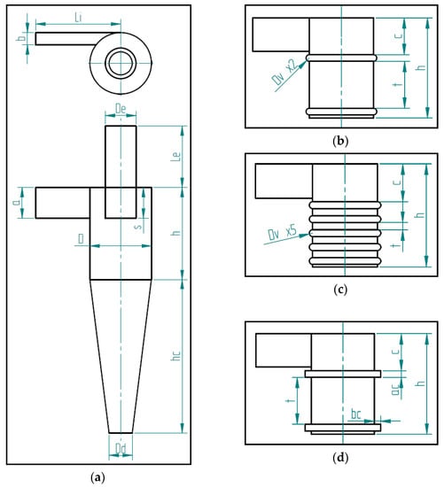 In terms of the vortex finder, the literature exposes certain differences that have had effects on the geometry of the exit duct. Regarding this aspect, Hoekstra [22] conducted an experiment using cyclones with smaller diameters in their vortex finder. The author found that the cyclones with less small diameter in their vortex finder conveyed a cutback in the cyclone’s central vortex, as well as a boost in the separation efficiency. Additionally, the research objective of El-Batsh [23] was to optimize the dimensions of the vortex finder. Five models of cyclone separators were tested in the study; each model had a unique geometrical configuration in its vortex finder. Results established that an increase in the diameter of the exit duct causes reductions in efficiency and in the pressure drop. Moreover, Xiang and Lee [24] and Brar et al. [14] have validated the impact of the diameter of the vortex finder. The authors found the relationship between the diameter of the vortex finder and the efficiency parameters of the cyclone. If this is the case, a reduction in the diameter of the exit duct leads to increments in the efficiency of separation and pressure drop of the cyclone concurrently.