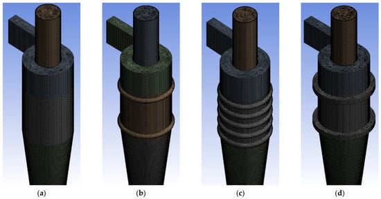 Meshing of cyclone models; (a) Model A (Stairmand) cyclone separator, (b) Model B cyclone separator, (c) Model C cyclone separator, (d) Model D cyclone separator.