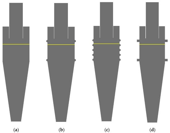 Schematic diagram of cyclone models; (a) Model A (Stairmand cyclone separator), (b) Model B cyclone separator, (c) Model C cyclone separator, (d) Model D cyclone separator.