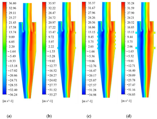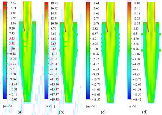 Contour plots of axial velocity of cyclone models; (a) Stairmand cyclone separator, (b) Model B cyclone separator, (c) Model C cyclone separator, (d) Model D cyclone separator.