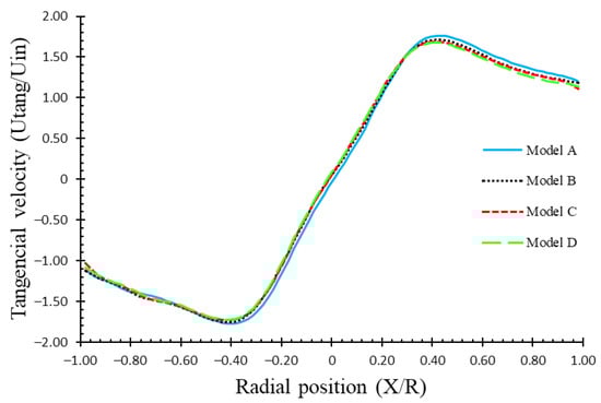 Tangential velocity is the most important parameter regarding flow velocity because it has a great impact on the separation efficiency since it determines the magnitude of the centrifugal force produced in the cyclone [11,22]. Figure 7 illustrates the tangential velocity profiles for all the cyclone models in a 217.5 mm axial station. According to the profiles, it is seen that this model, a Rankine vortex, which is made of an internal forced vortex with a tendency to rotate like a solid, where tangential velocity increases radially from the central axis of the cyclone, as well from a free external vortex, where tangential velocity values decrease as the radial distance increases [10,22]. Besides that, when the values and the shape of the profiles are analyzed between the models, it can be concluded that the flow in cyclones B, C, and D are not affected by the cavities in its cylindrical section, since its velocity profile is similar to model A. However, when the profiles are observed in detail, a decrease in the maximum value of the tangential velocity of cyclones B, C, and D can be seen, thus demonstrating a reduction in the intensity of the swirl in these models regarding Model A, as a result of the flow control technique used.