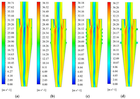Contour plots of velocity magnitude of cyclone models; (a) Model A (Stairmand cyclone separator), (b) Model B cyclone separator, (c) Model C cyclone separator, (d) Model D cyclone separator.