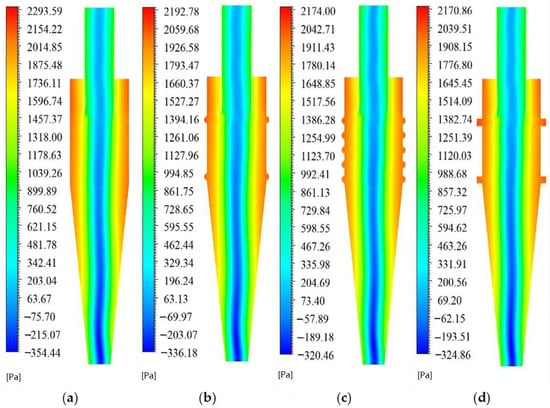 Contour plots of static pressure of cyclone models; (a) Model A (Stairmand cyclone separator), (b) Model B cyclone separator, (c) Model C cyclone separator, (d) Model D cyclone separator.