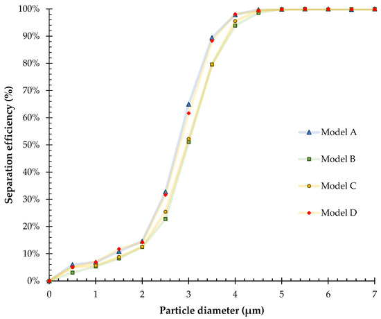 Figure 11 shows the grade efficiency curves of the four cyclone models. The cut-off diameter for each model is 2.76 μm, 2.98 μm, 2.96 μm, and 2.81 μm, respectively. In comparison with the Stairmand high-efficiency model (Model A), all the other models show an increase of the cut-off diameter, being the model D, the one that increases the less, which coincidentally is the model that generated the higher pressure drop reduction, as was already shown in Table 10.
