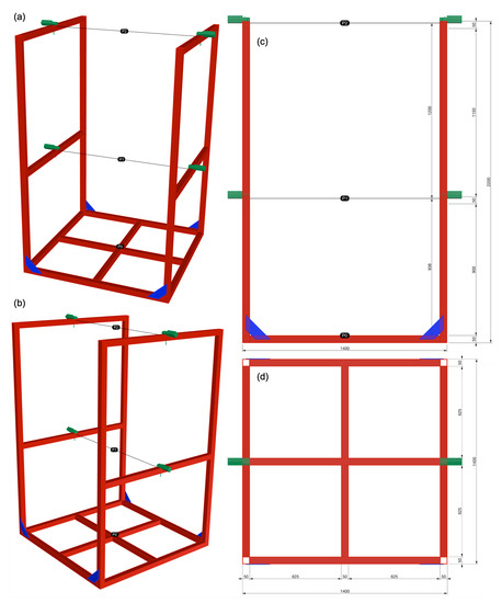 The newly constructed swing is split into two parts: (1) support structure and (2) the swing itself. Figure 1 presents an overview of the experimental set-up. The support structure is made of two identical steel frames providing a stable support due to its mass and the extended footprint. It can be moved by two persons and allows the use of two different pivot axes of the swing. This oscillating part is made of aluminium to reduce the total mass of the moving section. It has an inner spacing of 1.3 by 1.3 m and is open at the top to enable crane access. The blade edges are constructed of a quadratic stainless steel profile, which is machined to ensure a sharp edge by mounting it with an angle of 45 onto the aluminium profiles. Those parts are coloured green in Figure 2, which presents the dimensions of the swing.