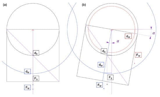Schematic visualisation of the acting forces F and distances d from the pivot point for the swing, additional model and masses: (a) empty swing, which is in balance represented by an angle = 0 (b) exemplary mass added so that = 10.