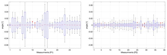 Boxplot analysis of the individual measurements (13,824 data points = 54 s × 256 Hz) normalised by the mean value of the measured angle for the lower pivots axis (P1) and the higher one (P2).