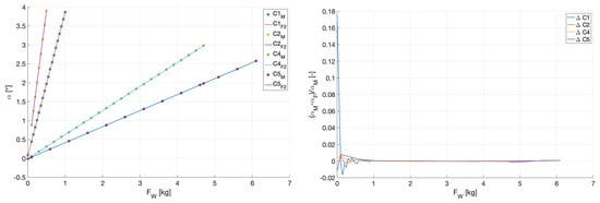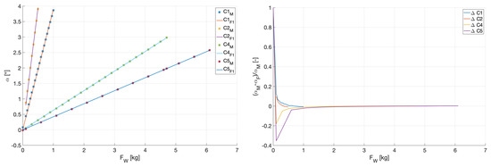 Figure 6 presents the results for the fitting based on the . The differences show a comparable distribution as for the fitting with but the normalised value reduces drastically from 1 to smaller 0.18. Two examples, namely for the analysis cases C1 and C4, are provided in Figure 7. The value for = 0 kg is a strong indicator how good the fitting with the original function performs.