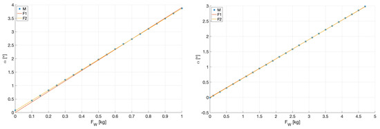 The initial point is set close to the expected distance but this assumption has been altered by a factor in the range of 0.1 to 10 to ensure that the result is independent of this first estimate [34,35]. Table 2 summarises the results for all analysis cases and indicates that the difference of the individual fittings are in the range of 0.5 mm of the average value for each pivot axis. The addition indicates that the values are referencing the initial Equation (3). Figure 5 focuses on the four individual measurement series and presents the direct comparison of measurement M and fitted data F. The standardised difference between those two values shows that especially around = 0 kg, the fitting has comparable big deviations. This is caused by the fact that the swing was not in a perfect zero position at the beginning of the measurement. As an improvement, a second function is defined, which allows a constant offset: