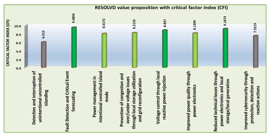 By aggregating these four dimensions and applying the critical factor index (CFI) analysis presented in the methodology section, the top three critical value attributes (see Figure 4 highlighted in green) were identified, i.e., fault detection and critical event forecasting, voltage control through local reactive power injection and reduced technical losses through power electronics and local storage/local generation. With almost the same level of CFI values, the second top three value propositions were identified (see Table 2 CFI with sample error correction and Figure 3 highlighted in light green), which were the power management in intentional controlled island mode, prevention of congestion and over/under voltage issues through local storage utilization and grid reconfiguration and improved power quality through power electronics.