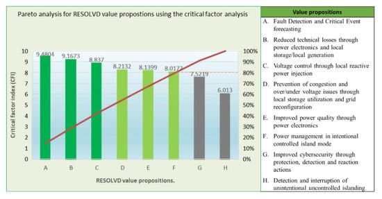 To overcome the LV grid challenges based on their criticality, the pareto analysis, which is known as the 80/20 principle, was used to systematically prioritize the propositions based on the CFI values. The pareto analysis showed the 80% of the challenges could be traced using the top six value propositions (Figure 5 green and light green), followed by improved cybersecurity through protection/detection/reaction actions and detection and interruption of unintentional uncontrolled islanding (see Figure 4 highlighted in gray color). Using similar contents of the critical factor analysis, the paper further implemented the pareto analysis as a methodology to justify how the decision makers could systematically compare the value propositions from technology developers’ perspectives against the broader survey targeting the DSOs. The pareto analysis was done to prioritize the value propositions and solve the linked challenges in a step-by-step manner. The results from the CFI analysis and pareto analysis varied slightly and were very close. These close values could be due to the smaller sample size of technology developers’ feedback. In this regard, further research would be needed with a large number of technology developers to avoid the inconclusiveness and for a better visualization of the results.