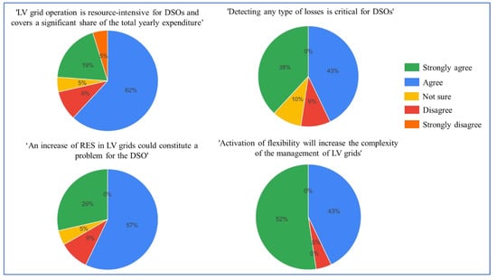 From Figure 6, it is clear that LV grid operation is a resource-intensive business, constituting a significant share of DSOs’ yearly expenditure. A total of 81% of respondents either strongly agreed or agreed that loss detection (both technical and non-technical) was still critical for DSO business. This is in line with the Council of European Energy Regulators’ (CEER’s) latest report on losses, where many DSOs in Europe have recorded losses above 5% []. Most DSOs were in favor of the opinion that increased renewable penetration was likely to cause problems with traditional operations of the grid. There has been clear evidence from various studies on the impact of high renewable energy penetration, particularly on distribution grids, including a report by the European commission []. The report also proposed a broader role of DSOs in the future to tackle the challenges associated with renewable energy source integration. Still, 14% of the responding DSOs thought that growing renewable energy was not going to cause any problems for their businesses. The reason could have been that they had already invested in a grid upgrade and/or were confident with their current grid capacity. However, the reason was not clear and needs further investigation.