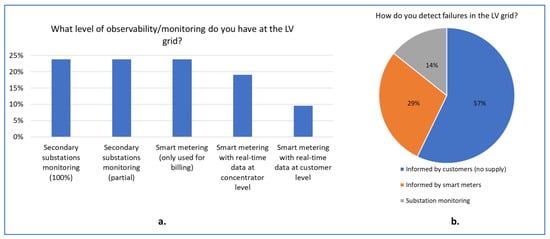 Regarding observability, 48% of DSOs were still limited to secondary substation monitoring. Only 9% of DSOs were using real-time data from smart meters at the customer level to know the grid status, while 24% were making use of smart meter data at the aggregated level for observing the grid (see Figure 7a). About 19% of DSOs were using smart meter data only for billing purposes. Figure 7b shows that more than 50% of DSOs still relied on customers to detect faults in the grid. Studies have shown that smart meter data can be used for detecting faults in the distribution network faster than traditional approaches []. The results showed that DSOs were missing out on getting this added benefit, even though most of the respondents were from countries with a high smart meter penetration. There was a clear gap between having access to data and the utilization of data for benefits. To take advantage of smart meter data, DSOs require specific tools, which RESOLVD has proposed to deliver through its LVD-DST, thereby filling the gap in market.