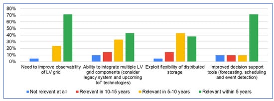 Part 2 comprised two types of questions. The first one was a list of high-level questions to grasp and validate the overall objectives of the project. These included the need to improve observability of the LV grid, the ability to integrate multiple LV grid components (such as the legacy system and upcoming IoT technologies), exploit flexibility of distributed energy storage and improved decision support tools (forecasting, scheduling and event detection). In this regard, the results from the respondents showed that there was an urgent need (within five years) to improve the decision support tools and observability of the LV grid (see Figure 8). Meanwhile, the flexibility and ability to integrate multiple LV grid components would be relevant in 5–10 years. Indeed, this depends on the availability of infrastructure and resources at the respondents’ premises and their plan to reach a high penetration of DERs. It is interesting to note also, from the pareto analysis presented previously in Figure 5, that the possibility of managing distributed energy storage was seen as relevant and prioritized, but that more than 60% of the respondents’ (DSOs) left this question as being most relevant in 5–10 years time. This could have been associated with the still manageable share of distributed renewable generation throughout the territory; thus, an urgent need of energy storage was mostly associated with the pace of the decarbonization of the grids.