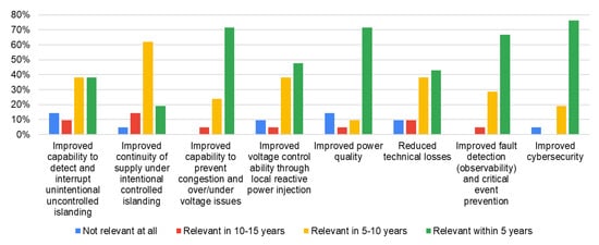 Figure 9 shows the responses on the relevancy and urgency of the H2020 RESOLVD value propositions. About 70% of the respondents believed that three of the value propositions (i.e., improved capability to prevent congestion and over/under voltage issues, improved power quality and improved fault detection and critical event prevention) would be relevant in the coming five years, with importance shown by technology developers in the S&R results as well. Cybersecurity issues were also ranked to be relevant in the near future but had a lower CFI in the S&R results. One reason for this could have been that most customers (DSOs) have their own internal cybersecurity service, as this was revealed on the survey conducted, and other technology developers have limited knowledge of cybersecurity and have different perceptions. According to the responses, value propositions related to islanding mode were likely to be more relevant in a 10–15-year timeframe. For the local reactive power injection capability and reducing technical losses value propositions, the DSOs were mostly split between less than five years and a 10–15-year timeframe. A probable reason for this split could have been due to differences in the renewable penetration rate in customers’ operating regions.