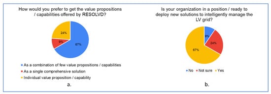 The DSOs’ responses showed that the RESOLVD value propositions were relevant in overcoming the existing and future challenges at the LV grid level. However, the urgency of the value proposed varied among the respondents. In general, the responses from the customer survey (DSOs) and S&R analysis (mostly technology developers) complemented each other on most of the value propositions. This indicates synergy between technology developers’ expectations pertaining to the RESOLVD solution and market needs. However, the results from both methods had small variations on a couple of the value propositions. An interesting observation is that from the DSOs perspective, cybersecurity was the first most rated proposition within a five-year timeline, which slightly differed from the technology developers’ views with a low CFI. Furthermore, 67% of the customers would have liked to get a combination of few value propositions, rather than a complete package (see Figure 8). This shows that different customers had different needs, and thus, the solution should be modular enough to be customizable for different customers.