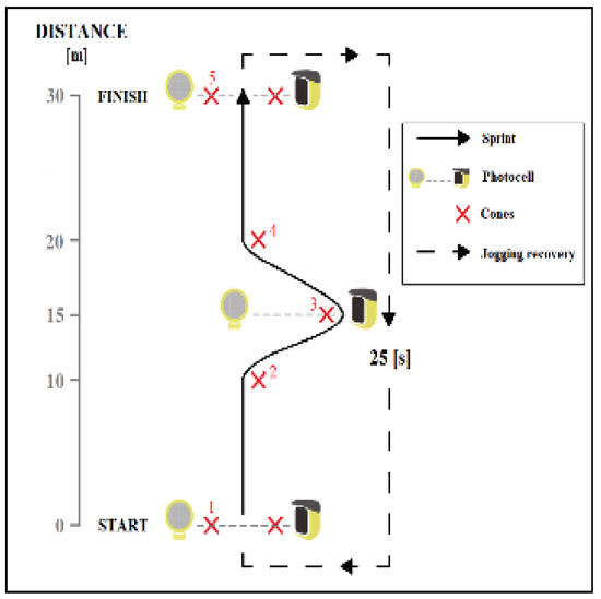 So far, several methods have been designed for testing repeated short-term, high-intensity exercise in soccer players [2,10,11,12,13,14]. The protocols often differ in terms of length, number of sprint repetitions, and rest intervals [15]. However, there is only one test that contains active rest involving changes in direction. It is the well-known curved sprint test [14], also known as the Bangsbo sprint test [16,17,18] or the sprint test [2]. Its remarkable feature lays in a track consisting of three changes in direction with length approximately 30 m, which simulates sprints in the match [14]. On the basis of the fact that the covered distance in a match is closely linked to the performance in the repeated short-term, high-intensity exercise, the curved sprint test is considered applicable for soccer players [14]. The test results are the time of the fastest sprint, the average sprint time, and the fatigue index. The collected data might be compared with the data of elite soccer players [14].