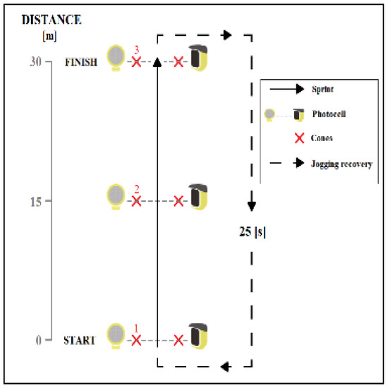 A player started from net N.1, with one leg placed on the starting line and the other leg placed behind the starting line. The player started sprinting to net N.5 once the examinator signaled the start. Right after the start, the player sprinted to the second cone, where he changed direction by circling the #2 cone from the outside and sprinted to the #3 cone. After circling the #3 cone from the outside, the player sprinted to the finishing line. Photocells used for measuring time were placed 1 m high and were located on the starting line, 15 m from the starting line, and on the finishing line. After the player finished the sprint, he returned to the starting line to start again. The player ran a total of 7 sprints with 25 s of active rest (low-intensity running). After the player finished every sprint, he had 25 s to return to the starting line. Then, the examinator counted down the last 3 s and measured both the total time as well as the time taken on singular distances.