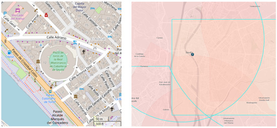 Target site—Maestranza bullfighting arena (left), source: OpenStreetMap; airspace map (right) (blue circle marks the place of the scenario). Source: https://drones.enaire.es/ (accessed on 25 April 2021).