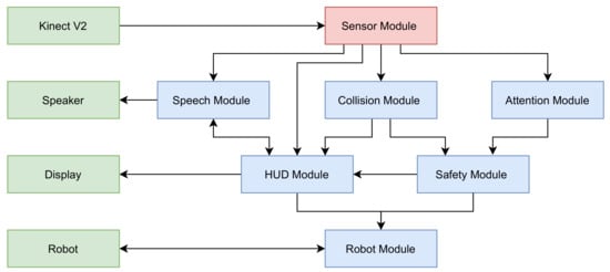 The system is split into different modules for simplicity and re-usability purposes: sensor module, HUD module, safety module, attention module, speech module, robot module and collision module. Each module is prepared to work as a standalone, using a publish and subscribe service (e.g., Robot Operating System (ROS): open source robotics middleware suite, or Message Queuing Telemetry Transport (MQTT): a lightweight, publish-subscribe network protocol) as a middleware. For the initial test, the modules are compiled together and share the data in a main program. The summary of the interaction and information flow can be seen in Figure 3.