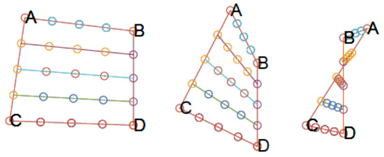 Representation of a ColQuad with a subdivision factor of five from three different perspectives. Note: in this example point A is not on the plane defined by BCD. The ColQuad is not a quadrilateral restricted to 2D but a 3D construct.