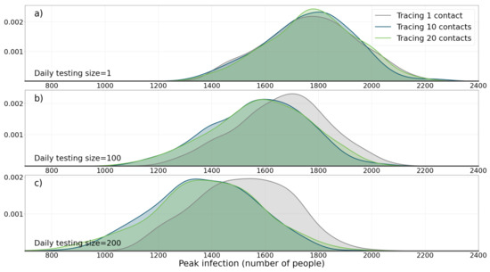 Figure 3 shows the results of the simulation. For each parameter setting, peak infection number in all 2000 experiments are recorded and then probability density function (PDF) of peak infection is drawn. The results of the experiment show that, as the size of daily testing size increases, the median of peak infection also decreases (compare the median of 1774 when daily testing size and contact tracing numbers are 1, with the median of 1384 when daily testing size is 200 and number of contact tracing is set on 20). A Mann-Whitney U test between the two distributions (distribution 1: daily size = 200 and tracing size = 20 and distribution 2: daily size = 1 and tracing size = 1) was conducted and a p-value of shows that the two distributions are significantly different. Perhaps, the most interesting result of this experiment is that the importance of contact tracing is revealed with large daily testing size. Increasing daily testing size, needs to be joined with contact tracing, in order to be really effective. This effect is pronounced with higher daily testing size numbers (Figure 3b,c). A Mann-Whitney U test between the two distributions (distribution 1: daily size = 200 and tracing size = 20 and distribution 2: daily size = 200 and tracing size = 1) were conducted and a p-value of shows that the difference between the two distributions is statistically significant.