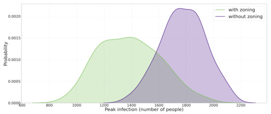 The effect of applying containment strategy II (zoning and travel restriction) on the population. This figure shows the effect of applying travel a restriction strategy on the p.d.f. (probability density function) of maximum daily number of infected agents during the course of epidemic. Here the zoning applies to agents so that they do not cross different areas of the urban space which is anchored from the initial position.