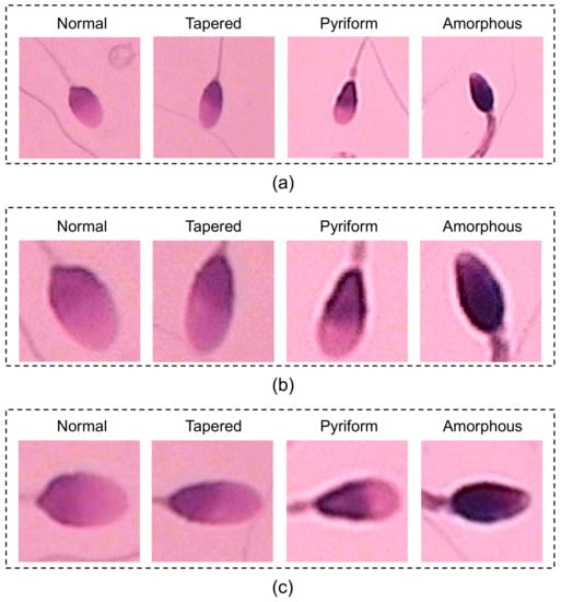 Human sperm consists of three main parts: head, midpiece and tail (Figure 1a) [7]. According to the World Health Organization, human sperm can be divided into normal sperm and abnormal sperm, and the abnormal sperm can be further classified into four sub-categories: head defects, neck and midpiece defects, tail defects, and excess residual cytoplasm [8]. Among these defects, head defects, including tapered, pyriform, no acrosome, small, amorphous, vacuolated and small acrosomal areas, have the most significant impact on sperm quality [8]. Herein, we mainly focus on the head malformations in this research. Although the Computer-Assisted Semen Analysis (CASA) system has been applied in various scenarios for semen analysis, it has not yet been able to classify human sperm morphologically [9]. In clinical applications, human sperm morphology analysis is conducted manually by experienced physicians, which is laborious, time-consuming, and highly subjective [10,11].