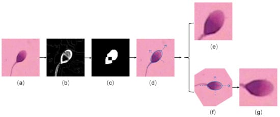 The visualization of image preprocessing. (a) The original image. (b) The gradient image. (c) The binary image after being morphologically eroded and dilated. (d) Ellipse fitting to the sperm head. (e) The cropped image. (f) The alighed image. (g) The aligned and cropped image.