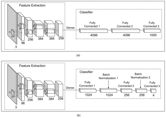 Since deep CNNs have achieved unprecedented results in many complicated computer vision classification tasks, it is proper to employ a deep CNN to deal with sperm cells classification problems. Here, the original AlexNet initially proposed by Krizhevsky in [23], as shown in Figure 4a, was modified to classify the sperm into corresponding classes morphologically. The architecture of the AlexNet-based transfer learning model for sperm image classification is shown in Figure 4b.