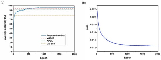 The training process of the AlexNet-based transfer learning method. The average accuracy of CE-SVM [13], APDL [14] and VGG16-based method [21] are also present for comparison. (a) The average accuracy varies with epochs. (b) The training changes loss with epochs.