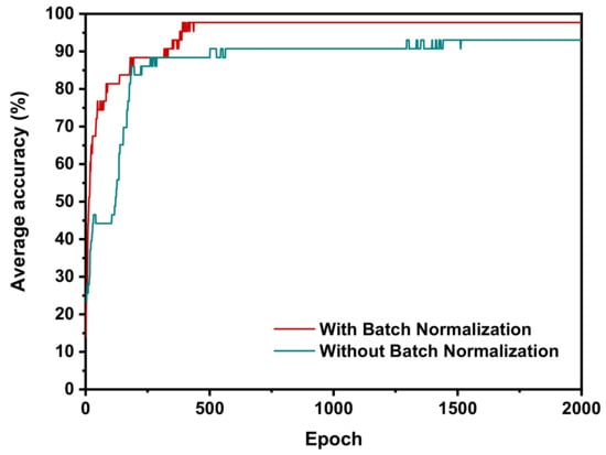 In addition to improving the classification accuracy, the Batch Normalization layer can also speed up the training process. In experiments, two training processes with and without Batch Normalization are compared and the training curves are plotted in Figure 7. The accuracy of the network with Batch Normalization reaches its maximum value at around 400th epochs, which is faster than that of the network without Batch Normalization (at around 1400th epochs). The results further indicate that the Batch Normalization layers can upgrade the learning ability of the classification model.