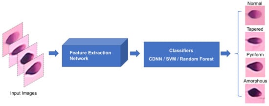 In this study, the HuSHeM dataset, a publicly available dataset for evaluating the sperm head classification algorithms, is used to investigate the proposed method. The samples were acquired from 25–38 years old patients at Isfahan Fertility and Infertility Center (IFIC) and then processed by the Diff-Quik method. After a series of biochemical treatments, sperm images were obtained under the microscope with a camera. More details about the HuSHeM dataset are available in [25]. According to the WHO criteria, the sperm samples in the HuSHeM dataset are classified and labeled by three specialists into four categories: normal, tapered, pyriform and amorphous (see Figure 2a). Totally 216 sperm cell images (54 normal, 53 tapered, 57 pyriform, and 52 amorphous) constitute the HuSHeM dataset and each image is in RGB format with the size of 131 × 131 pixels.