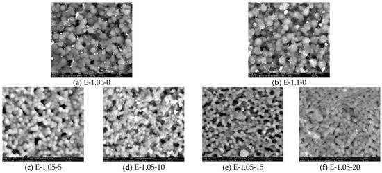 According to the results, the addition of mSD-(LDPE·EVA-RT27) reduced the particle size of the polymeric matrix and improved the sample structure homogeneity, since lower standard deviations were obtained. The particle size of the polymeric matrix structure was at a minimum for E-1.05-15 and E-1.1-10. Thus, the presence of MC increased the nucleation point during polymer formation, reducing the particle size of the polymeric matrix up to 10–15 wt.%. Nevertheless, from this point, the effect of the agglomeration due to the increase of the sample viscosity stabilized or even increased the particle size of the polymeric matrix [23].