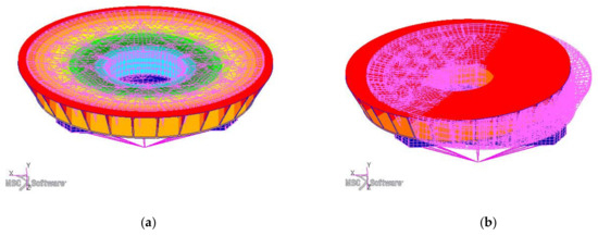 Modal analysis helps to understand the mirror’s structural characteristics by solving the natural frequency of the mirror assembly and its model shape. It is possible to intuitively understand the vibration form of the primary mirror and its supporting structure, which is the basis for analyzing the dynamic characteristics of the structure. This paper uses finite element software programs Hypermesh (Altair, Troy MI, USA) and MSC Patran (MSC Software, Los Angeles CA, USA) to mesh the mirror component structure model, set boundary conditions, and assign element attributes. The mirrored finite element model is shown in Figure 4, with 38,508 elements and 53,797 nodes.