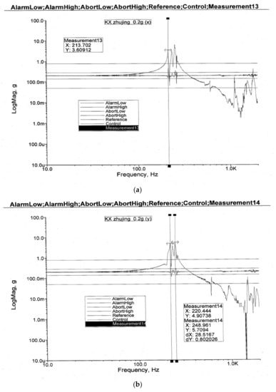 Results of the sine sweep test: (a) X direction sine sweep test; Fx = 213.702 Hz. (b) Y direction sine sweep test; Fy = 220.444 Hz. (c) Z direction sine sweep test; Fz = 298.413 Hz.