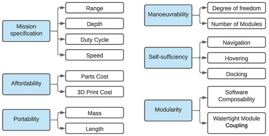 Ideally, all design requirements were defined at the top level to ensure that the mission of RoboFish was comprehensively covered. In the design process of RoboFish, the attributes that ensure meeting the minimum design requirements were further defined. This was achieved by creating Key Performance Attributes (KPAs) as depicted in Figure 2. KPAs were linked to the top-level design requirements in order to determine how RoboFish would meet the overall requirements of a subsea asset inspection mission. The current RoboFish KPAs are determined based on the mission of offshore wind farm inspection and are measurable design characteristics that control the overall effectiveness of the RoboFish design. The KPAs for the current prototype are listed in Table 1. Based on the top-level design requirements, a decision matrix was created to determine the best off-the-shelf options with regards to batteries, cameras, servos and micro-controllers. Using KPAs, associated weights are used to evaluate each decision matrix. In general, the authors were guided by a design philosophy that can be quoted as: