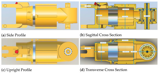 This is a 3D printed enclosure using Acrylonitrile Styrene Acrylate (ASA) material. The primary part of the enclosure takes the form of cylinder of 9.3 cm internal diameter and 23.3 cm length, as shown in Figure 3. The total length of a segment can be variable with any modifications that are needed, but the length of the current configuration is 43 cm due to the size of the servomotors used. To reach the inside of the enclosure, O-ringed stainless steel rings with a male-to-female fit are used to hold the two parts of the enclosure together. This allows convenient disassembly while keeping the system watertight under high pressure. The enclosure is designed with a fork at one end to interlock with the rotor of the following segment, whereas the other end of the enclosure is fused to a magnetic coupling joint containing a rotor. The top of the enclosure allows wire entry via M10 penetrators, making a waterproof, high-pressure seal to pass Ethernet cable into the segment. The bottom of the segment is fitted with a M10 plugged vent, allowing trapped pressure to escape from the segment while it is being closed. This is also used for testing water tightness on the segment using a vacuum pump inserting into the enclosure vent. Segments are joined together using a magnetic-coupling joint that allows a servo in each joint to rotate an external rotor that in turn rotates an internal rotor to move the next joint connected to the fork. Four guides with holes are built in on the outside circumference to allow the attachment of fins, ballast, or other accessories as required. Internally, components are mounted on a 3D-printed mounting plate. The servo fits into a 3D-printed frame moving on linear rails, working as a tilting drawer to provide the required tension for the timing belt by adjusting the sliding servo on the rails and locking it in place with two screws.