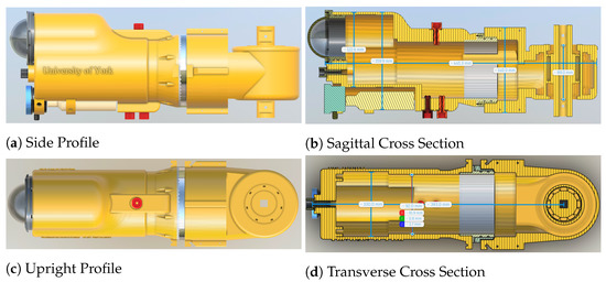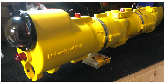 This is a modified segment with the same 9.3 cm diameter cylindrical enclosure, but with a front end that appears like a cockpit, allowing the attachment of clear acrylic dome end cap. The dome shape allows for extra room within the head for additional two or more cameras or sensors. It gives the camera a wider view than that of a flat end cap. It is very transparent and does not warp or distort camera images. The dome is fit into the head using a flange that has a double O-ring seal. Like the other segments, the head enclosure is fit with a pressure-releasing vent and two cable penetrators. It is also provided with an additional M10 penetrator at the nose of the head, allowing a waterproof high-pressure seal to pass a 4–8 mm tether into the head (should it be required). To mount the acoustic modem and rangefinder on the head without being obstructed, the head has an external hollow at the bottom, in which both devices are placed. Internally, like in the segment, components are mounted on a 3D-printed mounting plate, and a servo is fitted into a pull-on 3D printed frame (shown in Figure 4).