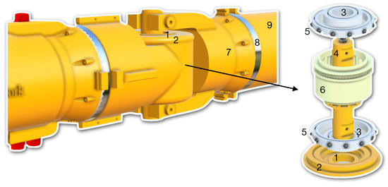 This is a mechanism that mechanically joins two watertight enclosures together and transmits the torque of a rotary actuator between an outer driving shaft and an inner driven shaft without physical contact. This enables a servomotor in one of the enclosures to actuate the other enclosure and achieve a precise control of angular position, velocity and acceleration of the body. The contactless bond is created by the magnetic attraction of a number of magnetic blocks evenly distributed on the side surface of the two shafts with opposite polarity. This allows the two enclosures to function like a robotic arm with rotational joint motion. To keep costs to a minimum, off-the-shelf small magnetic bricks were used. Figure 6 illustrates the magnetic joint’s internal parts. The recent paper [30] provides additional details about the implementation of RoboFish magnetic coupling joints and how to maximise the transmittable torque with different numbers, types and arrangement of magnetic blocks.