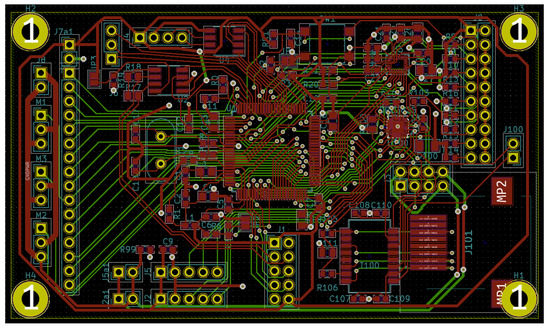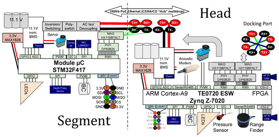 To fulfil the requirements stated in the previous section, while also making the platform upgradable in the future, the Xilinx Zynq 7000 SoC platform was chosen for the main processor of the system. The Zynq 7000 SoC is built around a hybrid processor and FPGA architecture. It consists of two ARM Cortex-A9 processor cores and Artix-7 FPGA-programmable logic, with a high-bandwidth AMBA–AXI interface between them. This platform enables rapid development of software systems using a Linux operating system on the processor cores, with the ability to offload processor-intensive tasks to the FPGA fabric. Offloading demanding tasks to the FPGA speeds up execution time for tasks like vision processing with potential power-saving benefits too, which is important for a battery-powered autonomous vehicle such as this. The FPGA fabric can also be used to create an inter-segment communications controller for communicating between the head and other segments without sacrificing processor time, resulting in higher-reliability communication. For the other segments in the robot, the STM32 platform was chosen. Each segment is a modular element of the system, which accelerates development and upgradability.