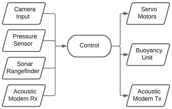 As the RoboFish project aims to produce an autonomous agent, significant processing capabilities are required. On board real-time vision processing is required for navigation. Acoustic communication is required for feedback and issuing control commands during operation. Pressure sensing is required for water depth acquisition. A SONAR sensor is used for range-finding. Each of these sensory inputs are to be used as inputs to the control system of the robot. Actuation is produced using servo motors. The system of inputs and outputs is summarised in Figure 8.