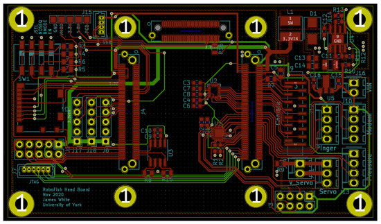 Fish-like robots have been an active research area due to the remarkable physical mobility of fish in nature. A review of biomimetic robotic fish, their gaits and actuators is provided in [21]. The eel gait (Anguilliform) is most suitable for the current eel-like body of RoboFish, and the trout gait (Subcarangieform) is more likely to show instability in this kind of robot than robotic fish with a trout-like body [22]. The eel gait is used in many similar robot fish and is well known in the literature. Reference [23] shows an underwater snake robot named Mamba created in 2016. These long and slender robots can maneuvre through narrow openings and confined areas. Other related fish-like robot projects include Envirobot by EPFL [24] and ACM R5 by Hirose Fukushima Robotics lab in Japan [25]. The Envirobot platform has improved energy use and efficiency than this lab’s previous segmented anguilliform swimming robots and uses an ARM microcontroller in the head unit and additional microcontrollers in each body segment. ACM R5 was developed in 2005 and to be an amphibious snake-like robot that undulates its body to move both on land and underwater. ACM R5 uses paddles for water locomotion and passive wheels on land and uses an advanced control system that includes a CPU, a battery and motors in each independently operating segment. Segments communicate to coordinate and identify automatically how many segments are joined, providing the ability to remove, add and exchange segments freely.