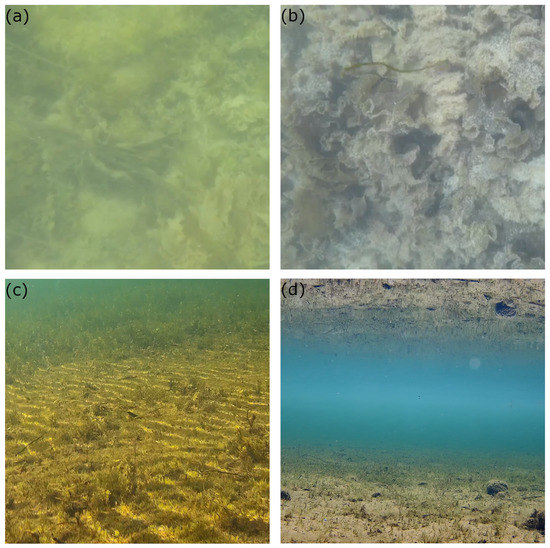 RoboFish Computer Vision Challenges: (a) almost completely green image showing limited visibility, (b) floating particles in the foreground, (c) water caustics on a lake bed, created by the surface of the water, and (d) total internal reflection underwater causing a mirror image of a lake bed in the water surface.