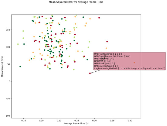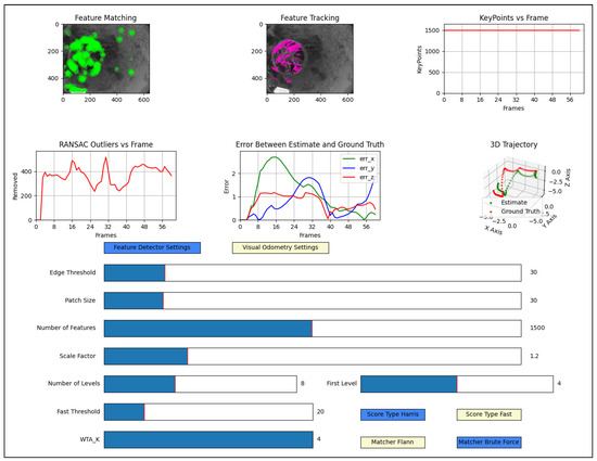 The GUI was built in Python using the Matplotlib library. It was decided that only ORB [37] and BRISK [38] feature-matching algorithms would be tested; however, the design enables the addition of SIFT [39] and SURF [40] feature detectors with only minor modifications. Figure 13 shows the GUI. It enables the adjustment of either ORB or BRISK parameters in real-time via sliders and buttons, with the effects of these changes visible both qualitatively in the overlaid video feeds and quantitatively in the graphs. Parameters can also be set prior to a test, and it enables a previous test’s data to be displayed simultaneously on the graphs, allowing comparisons of performance for each test. The camera’s position is estimated using VO, the implementation of which was based closely on PySLAM [41].